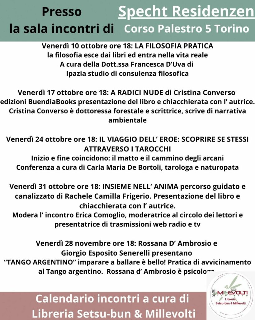 Gli incontri di questa sezione sono organizzati dalla libreria presso la sala incontri di Specht Residenzen di corso Palestro 5 a Torino.